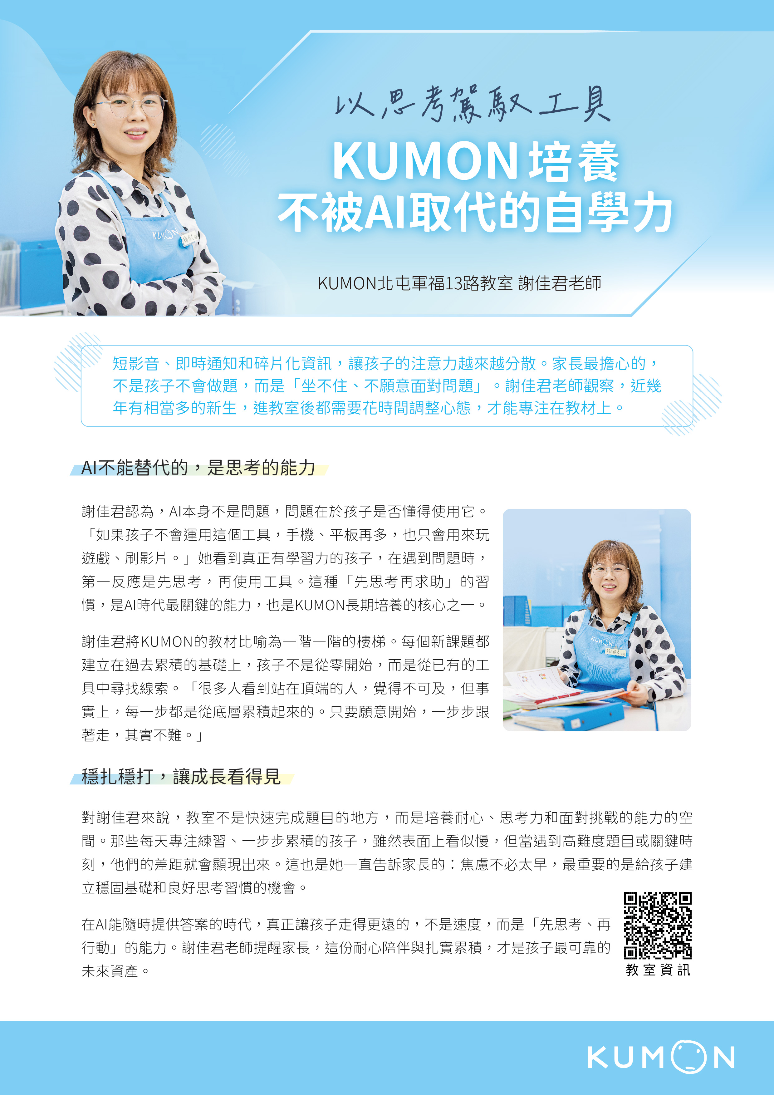 謝佳君認為,AI本身不是問題,問題在於孩子是否懂得使用它。「如果孩子不會運用這個工具,手機、平板再多,也只會用來玩遊戲、刷影片。」她看到真正有學習力的孩子,在遇到問題時,第一反應是先思考,再使用工具。這種「先思考再求助」的習慣,是AI時代最關鍵的能力,也是KUMON長期培養的核心之一。