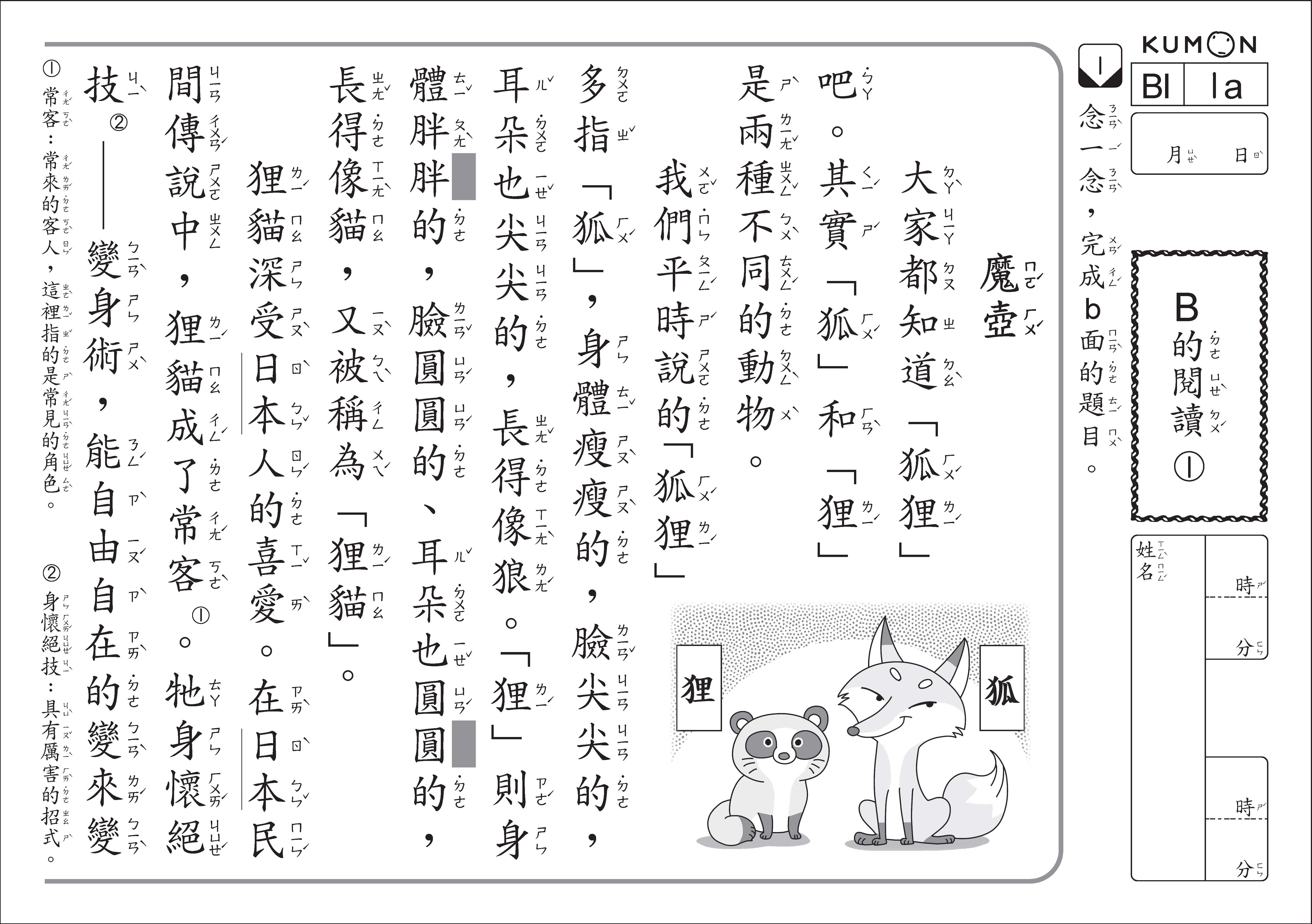 KUMON 國語以培養高度閱讀力為目標,從認讀語詞、豐富詞彙量開始,透過學習注音與國字,建立對基本句型的概念、理解各種語詞及句式,逐步培養閱讀文章的能力。