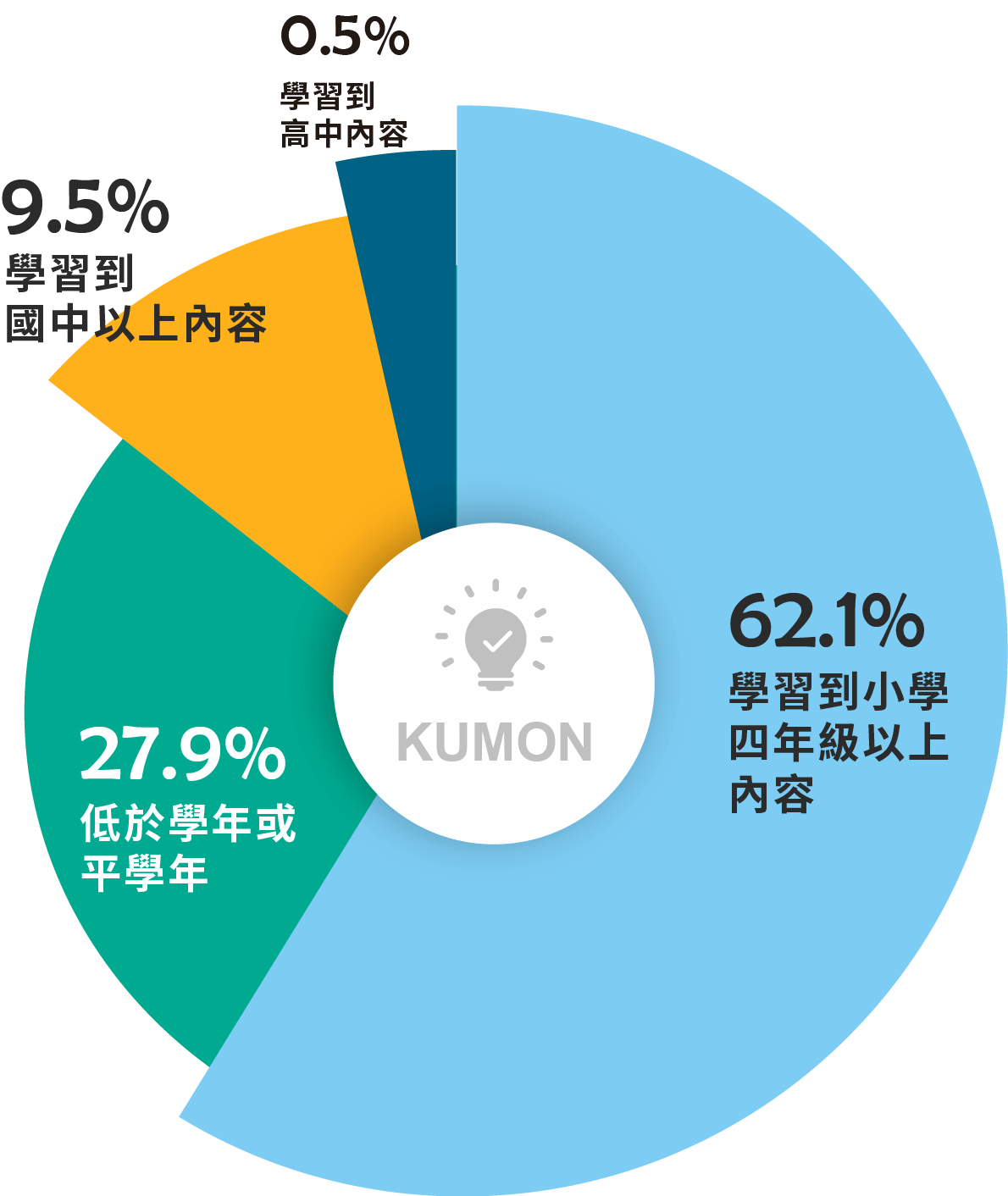 統計18年台灣國小三年級的KUMON學生對於KUMON教材學習(包含新入學及持續學習的孩子),有超過60%的孩子已經學習到小學四年級以上的内容,有10%的孩子學習到國中以上的內容。