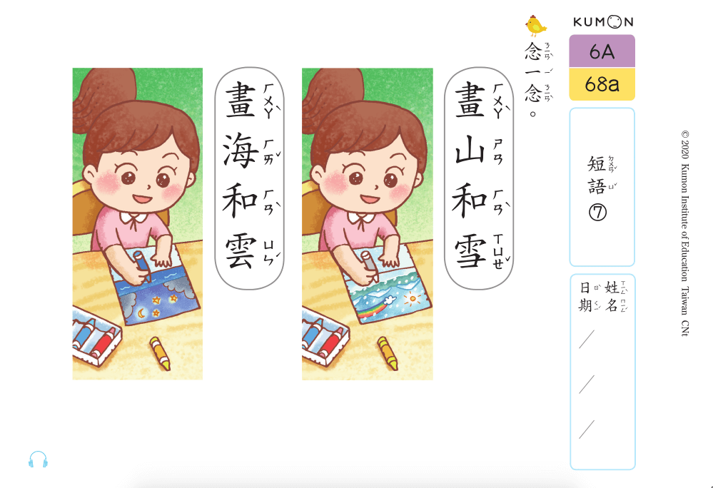 KUMON 國語以培養高度閱讀力為目標,從認讀語詞、豐富詞彙量開始,透過學習注音與國字,建立對基本句型的概念、理解各種語詞及句式,逐步培養閱讀文章的能力。